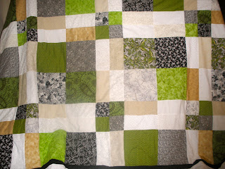 The main idea of this quilt is that you have strips of three fabrics and one on the outside is always the same color so you can make a stair-step running through your quilt. I chose the color green for my "stair-step" fabric but did different variations of it so it's not as obvious as the pattern intends.